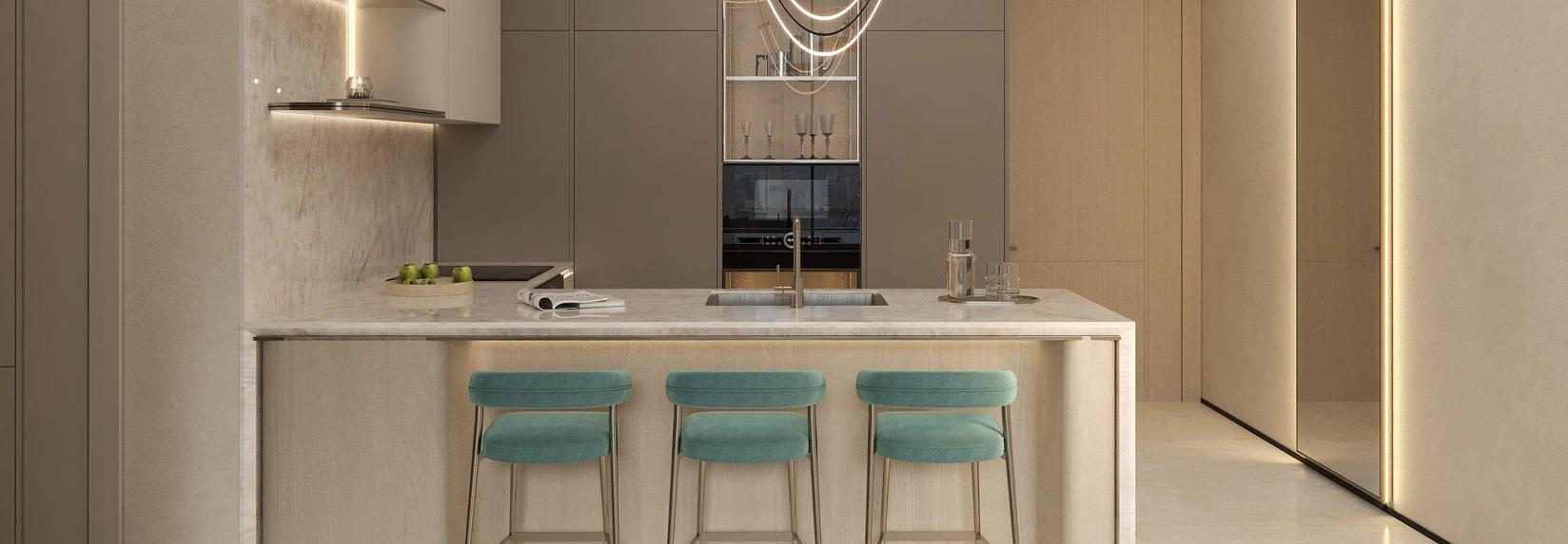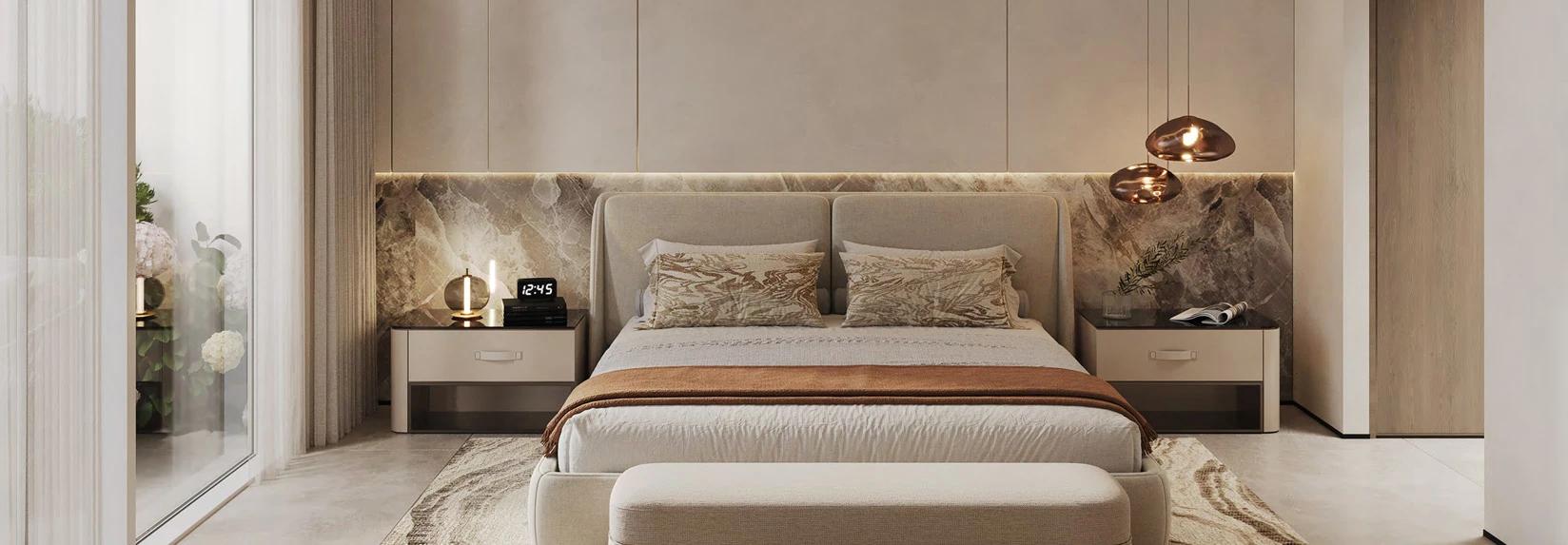 All units are fully furnished with high quality interior design integrated with appliances and smart home systems. Units are furnished with soft, neutral palette including pearl whites, warm sandy tones and smoky greys with sleek and contemporary European tiles, natural stone surfaces with high quality wooden cabinets that bring warmth, elegant and minimalist aesthetic luxury vibe.